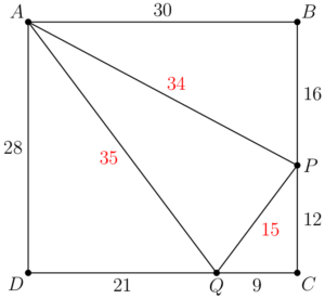Hence, we get $CQ = CD - DQ=30-21=9$ and $CP = BC - BP=28-16=12$. We see that $\triangle{CPQ}$ is a right triangle with side length ratios $(3,4,5)$, and the hypotenuse $PQ$ is equal to $15$.
