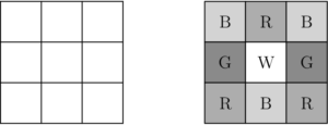 Each square in a $3\times3$ grid of squares is colored red, white, blue, or green so that every $2\times2$ square contains one square of each color. One such coloring is shown on the right below. How many different colorings are possible?
