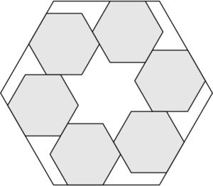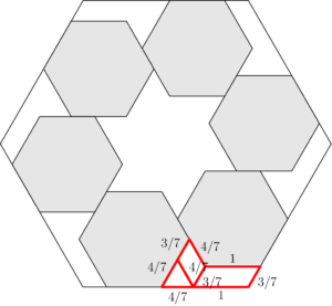 We see that the length of the bottom edge of the hexagonal frame is $\dfrac37+1+\dfrac47+1=3$. The area of the region inside the frame not occupied by the blocks is the area of the hexagonal frame subtracts the areas of 6 hexagonal blocks. Note that the area of a regular hexagon with side length $a$ is the sum of the areas of 6 equilateral triangles with side length $a$, and the area of each triangle is $\dfrac{\sqrt3}{4}a^2$. Thus, the area of a regular hexagon with side length $a$ is $6\times\dfrac{\sqrt3}{4}a^2=\dfrac{3\sqrt3}{2}a^2$. The answer is $$\dfrac{3\sqrt3}{2}\times3^2-6\times\left(\dfrac{3\sqrt3}{2}\times1^2\right)=\dfrac92\sqrt3$$