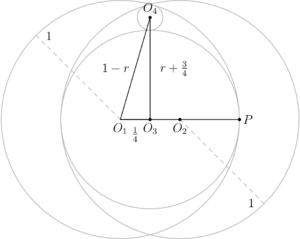 Let $O_4$ be the center of circle $C_4$, and $r$ be the radius of circle $C_4$. By symmetry, we see that $O_3O_4\perp O_1O_2$. In right triangle $O_1O_3O_4$, we have $O_1O_3=\dfrac14$, $O_3O_4=r+\dfrac34$, and $O_1O_4=1-r$. By the Pythagorean theorem, we have $$\left(\dfrac14\right)^2+\left(r+\dfrac34\right)^2=(1-r)^2$$ Solving, we get $r =\dfrac{3}{28}$.