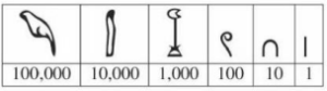 The first hieroglyph is worth $10,000$, the next four are worth $100 \times 4 = 400$, then the next two are worth $10 \times 2 = 20$, and the last three are worth $1 \times 3 = 3$. Therefore, the answer is $10,000 + 400 + 20 + 3 = 10,423$.