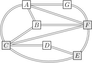The Konigsberg School has assigned grades 1 through 7 to pods $A$ through $G$, one grade per pod. Some of the pods are connected by walkways, as shown in the figure below. The school noticed that each pair of connected pods has been assigned grades differing by 2 or more grade levels. (For example, grades 1 and 2 will not be in pods directly connected by a walkway.) What is the sum of the grade levels assigned to pods $C, E$, and $F$?