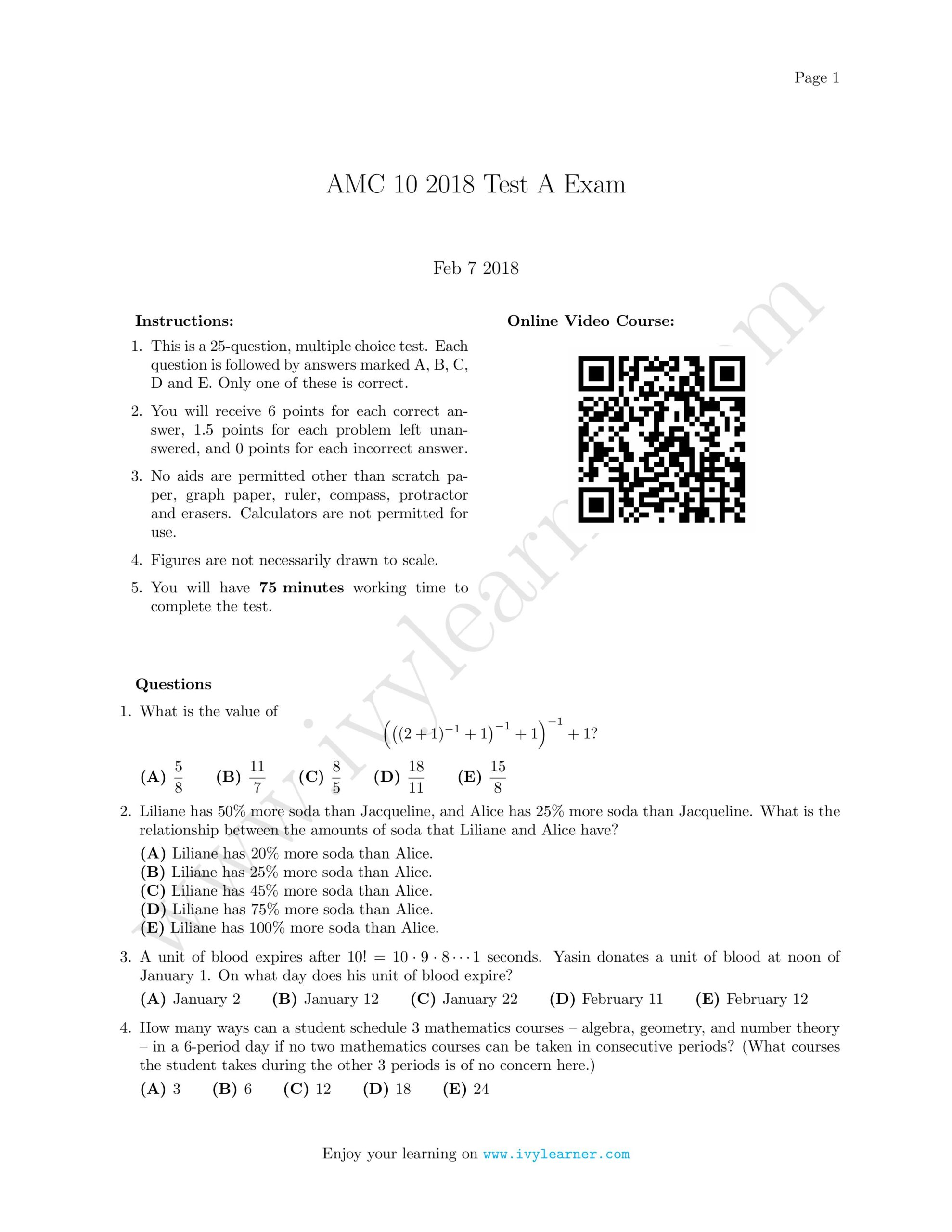 / AMC 10 2018 Test A Exam